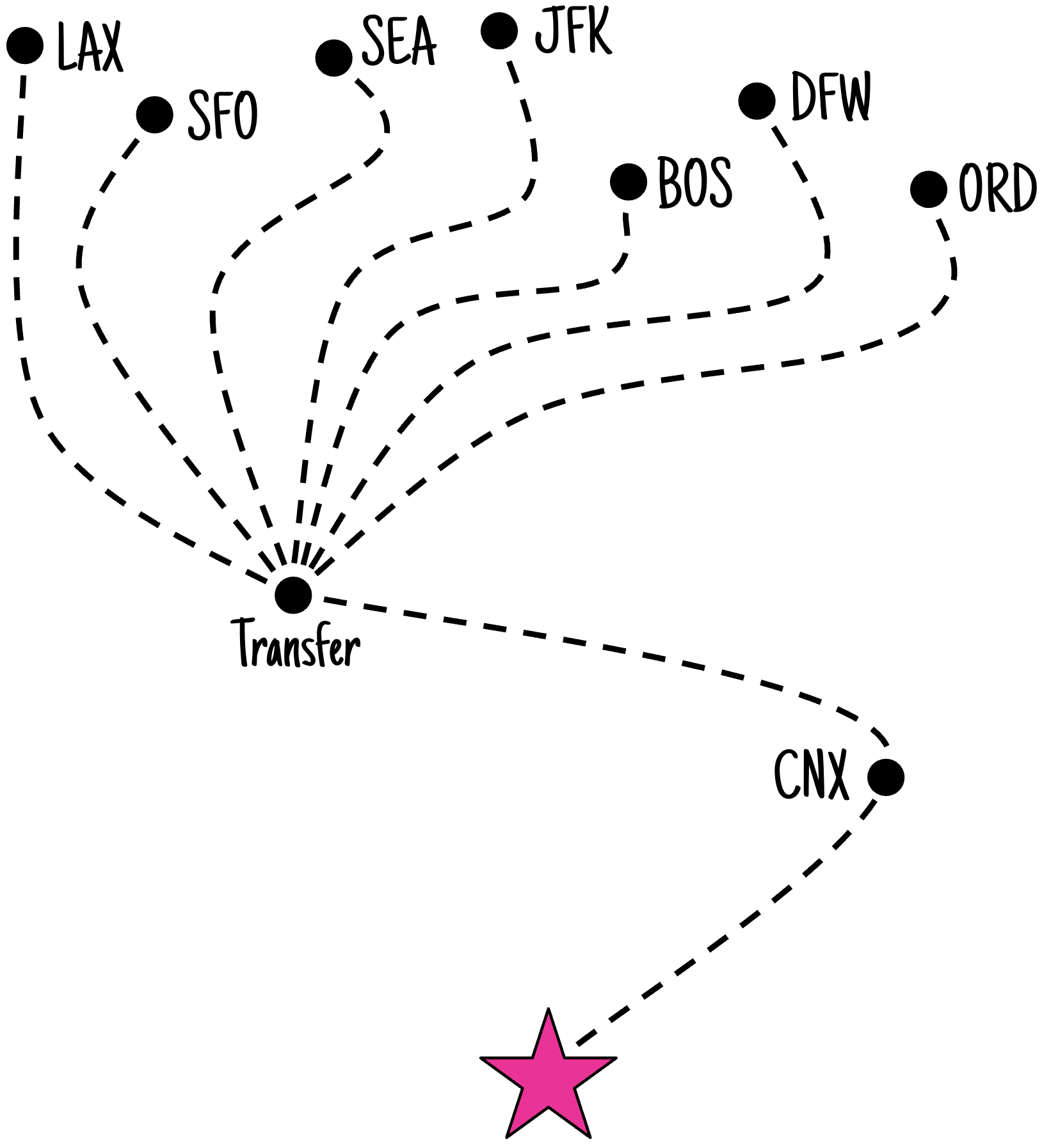 The magic carpet from San Francisco departs at 12:50pm and arrives at 9:55pm local Thailand time. Los Angeles, Seattle, Boston, Dallas, Chicago — all have similar routes, all potential travel magic.